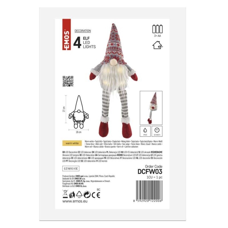 barva drátu: neuvádí se|barva světla: teplá bílá|časovač: ne|dálkový ovladač: ne|délka přívodu: neuvádí se|krytí: IP20|materiál: neuvádí se|počet LED: 4|použití: vnitřní|příkon: 0,22 W|prodejní obal: 1 ks, krabice|produkt: skřítek|rozměr: 18 × 12 × 27 cm|typ napájení: baterie 3× AA (není součástí balení)|vstupní napětí: neuvádí se|výstupní napětí: 4,5 V DC|záruční doba: 2 roky|zdroj svícení: LED|životnost: 10 000 hodin