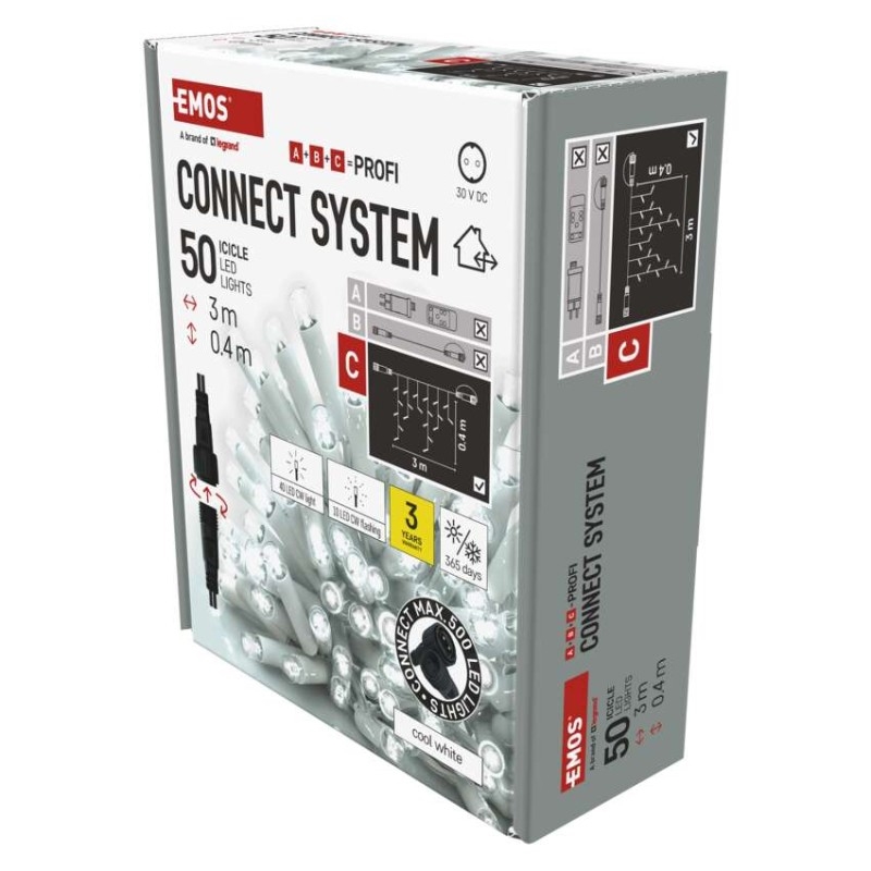 Propojovací systém CONNECT SYSTEM PROFI je díky stupni krytí IP44 vhodný k vnitřnímu i venkovnímu použití. Vyznačuje se zvýšenou odolností materiálu a prodlouženou zárukou 3 let. Vysoce kvalitní gumové kabely umožňují celoroční instalaci bez nutnosti demontáže za jakýchkoliv teplotních podmínek. Vybírat můžete ze standardních řetězů, krápníků a clusterů. Z jediného napájecího zdroje (A) připojeného k prodlužovacím kabelům, rozbočovačům (B) a světelným LED prvkům (C) je možné napájet až 500 LED světýlek.