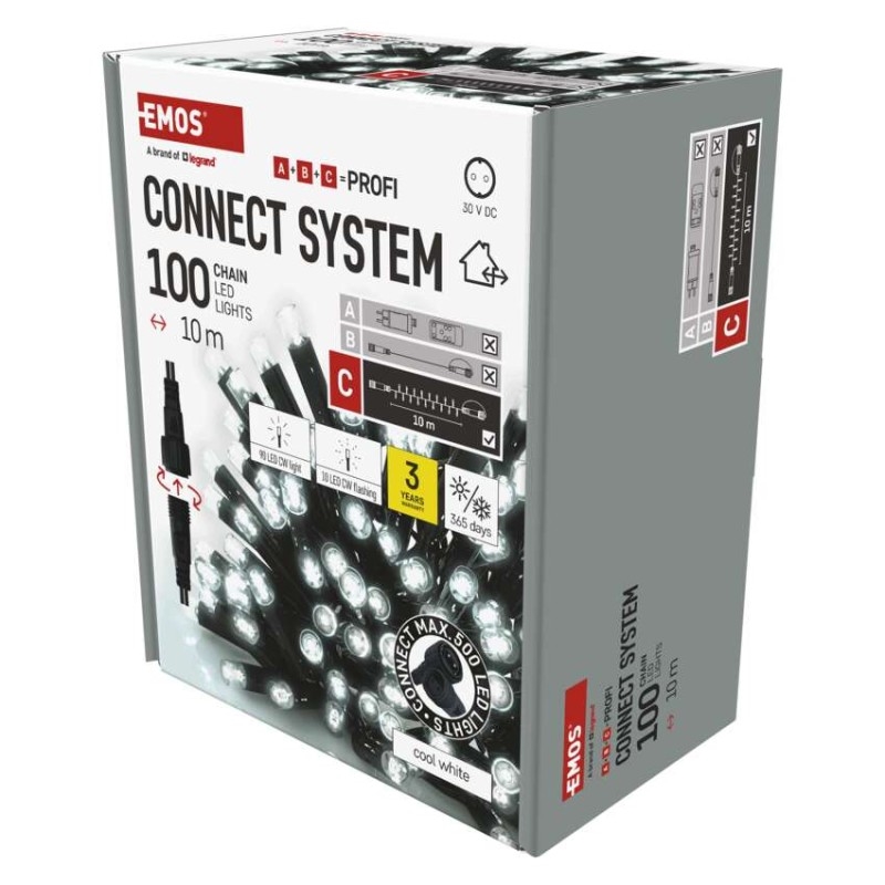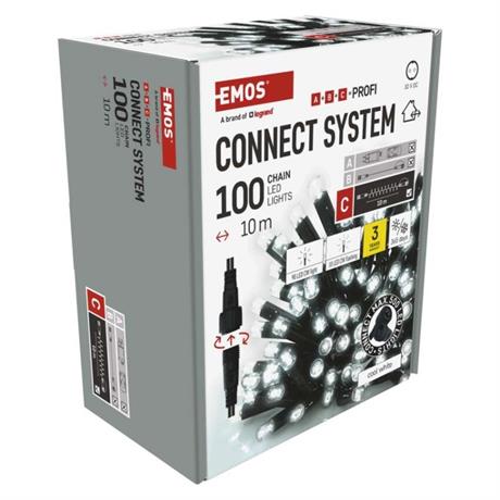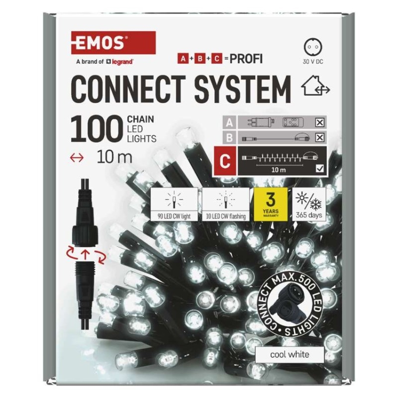 Propojovací systém CONNECT SYSTEM PROFI je díky stupni krytí IP44 vhodný k vnitřnímu i venkovnímu použití. Vyznačuje se zvýšenou odolností materiálu a prodlouženou zárukou 3 let. Vysoce kvalitní gumové kabely umožňují celoroční instalaci bez nutnosti demontáže za jakýchkoliv teplotních podmínek. Vybírat můžete ze standardních řetězů, krápníků a clusterů. Z jediného napájecího zdroje (A) připojeného k prodlužovacím kabelům, rozbočovačům (B) a světelným LED prvkům (C) je možné napájet až 500 LED světýlek.
