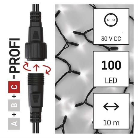 barva drátu: černá|barva světla: studená bílá|časovač: neuvádí se|dálkový ovladač: ne|délka přívodu: 10 cm|funkce: svítí/bliká|krytí: IP44|LED mezera: 10 cm|materiál: guma|možnost propojení: ano|počet LED: 100|použití: venkovní i vnitřní|příkon: max. 6 W|prodejní obal: 1 ks, krabice|produkt: řetěz|pro výšku stromu: neuvádí se|rozměr: 10 m|tvar: klasický|typ napájení: síťový adaptér (není součástí balení)|velikost LED: 7 mm|vstupní napětí: 30 V DC|výstupní napětí: neuvádí se|záruční doba: 3 roky|životnost: 10 000 hodin