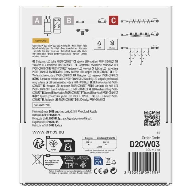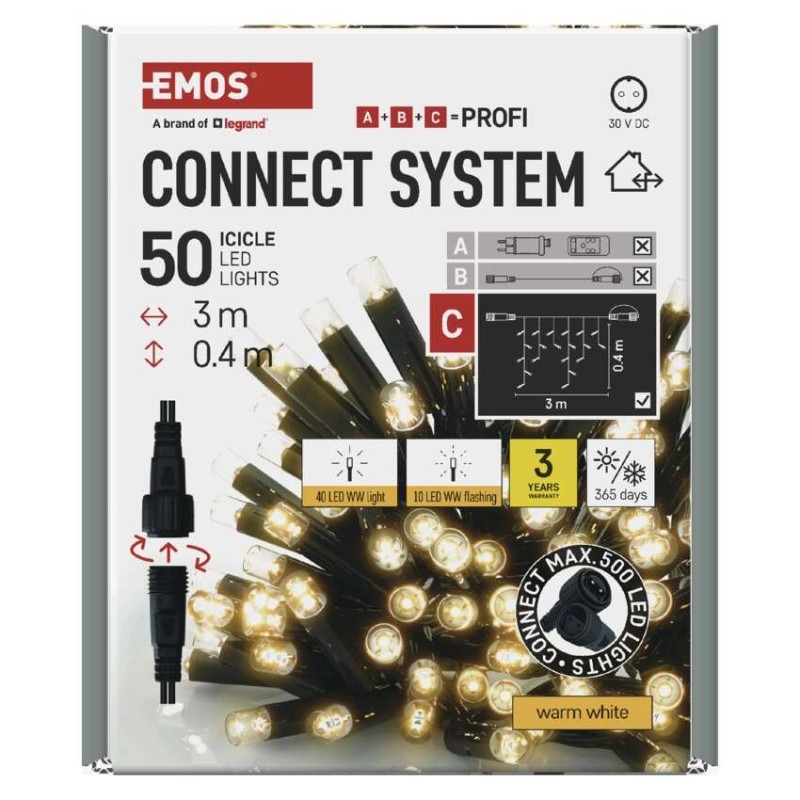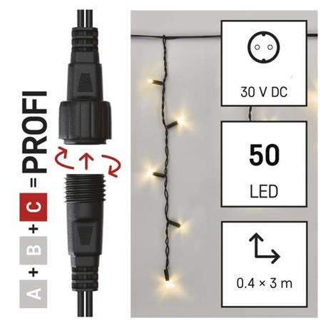 Propojovací systém CONNECT SYSTEM PROFI je díky stupni krytí IP44 vhodný k vnitřnímu i venkovnímu použití. Vyznačuje se zvýšenou odolností materiálu a prodlouženou zárukou 3 let. Vysoce kvalitní gumové kabely umožňují celoroční instalaci bez nutnosti demontáže za jakýchkoliv teplotních podmínek. Vybírat můžete ze standardních řetězů, krápníků a clusterů. Z jediného napájecího zdroje (A) připojeného k prodlužovacím kabelům, rozbočovačům (B) a světelným LED prvkům (C) je možné napájet až 500 LED světýlek.