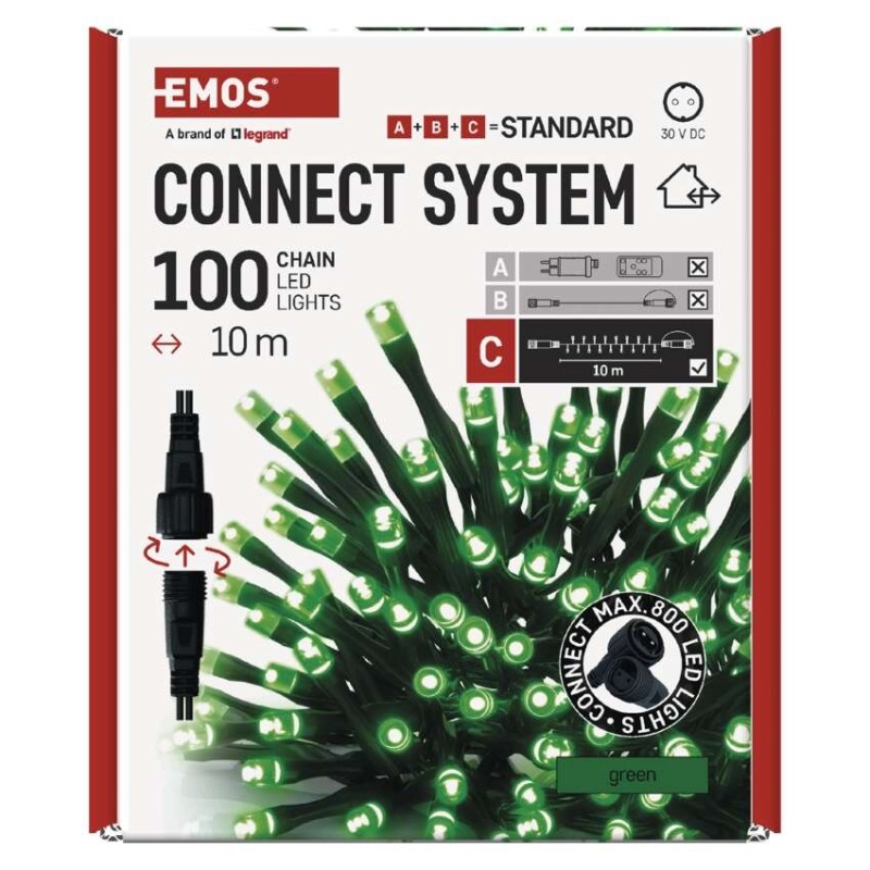 Propojovací systém CONNECT SYSTEM STANDARD je díky stupni krytí IP44 vhodný k vnitřnímu i venkovnímu použití, avšak pouze v sezónu, nikoliv po celý rok. Výhodou tohoto spojovacího systému je široká nabídka LED světelných prvků (C) v několika různých barvách. Ačkoliv je nejpopulárnějším vánočním osvětlením řetěz, ve spojovacím systému můžete vybírat podle vlastních designových preferencí z krápníků, záclon, sítí nebo hvězd na špičku vánočního stromu. Z jediného napájecího zdroje (A) připojeného k prodlužovacím kabelům, rozbočovačům (B) a světelným LED prvkům (C) je možné napájet až 800 LED světýlek.