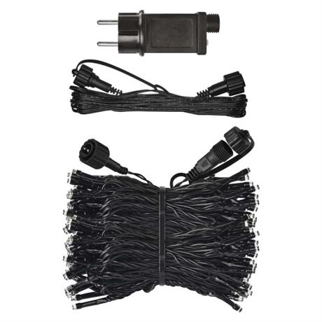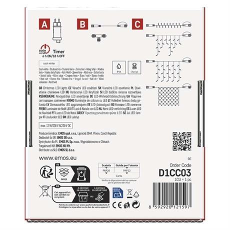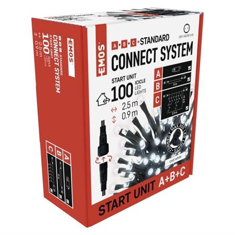 Základní sada systému CONNECT STANDARD obsahuje vše potřebné k tomu, abyste mohli ihned začít s výzdobou vašeho domu, zahrady nebo interiéru. V jednom balení naleznete tři základní komponenty systému nutné pro jeho provoz – napájecí zdroj s časovačem (A), prodlužovací kabel o délce 5 m (B) a vánoční krápníky (rampouchy) o délce 2,5 m se 100 LED diodami (C).