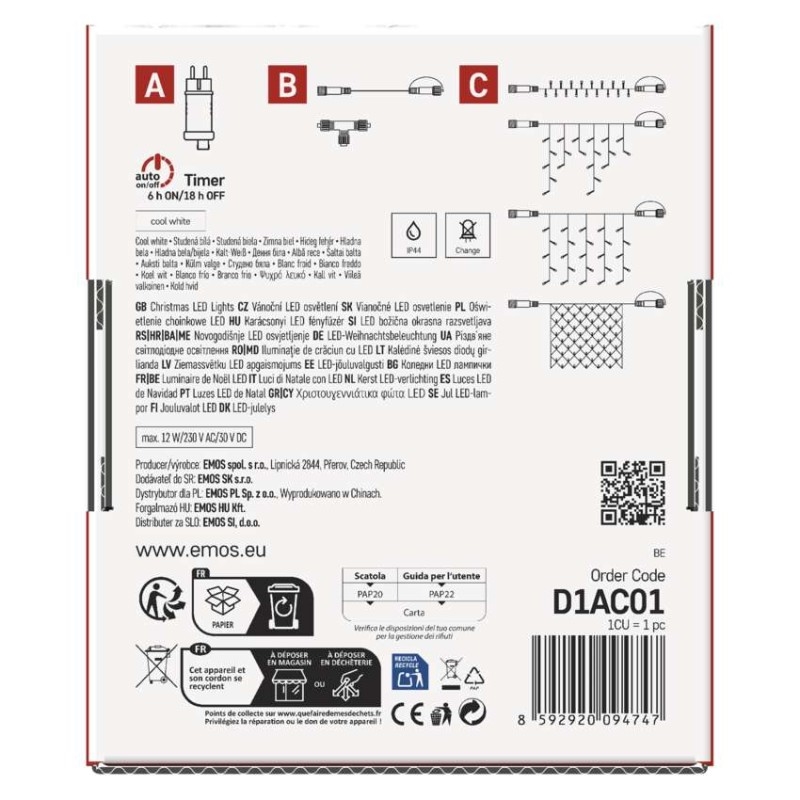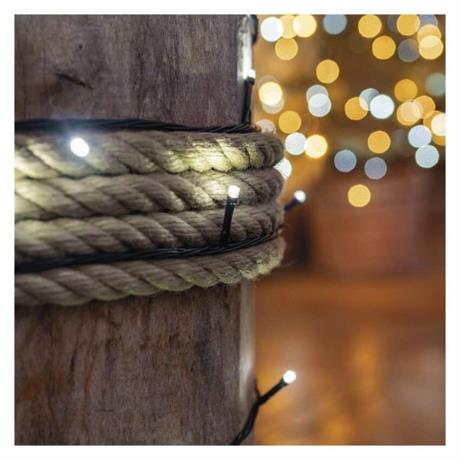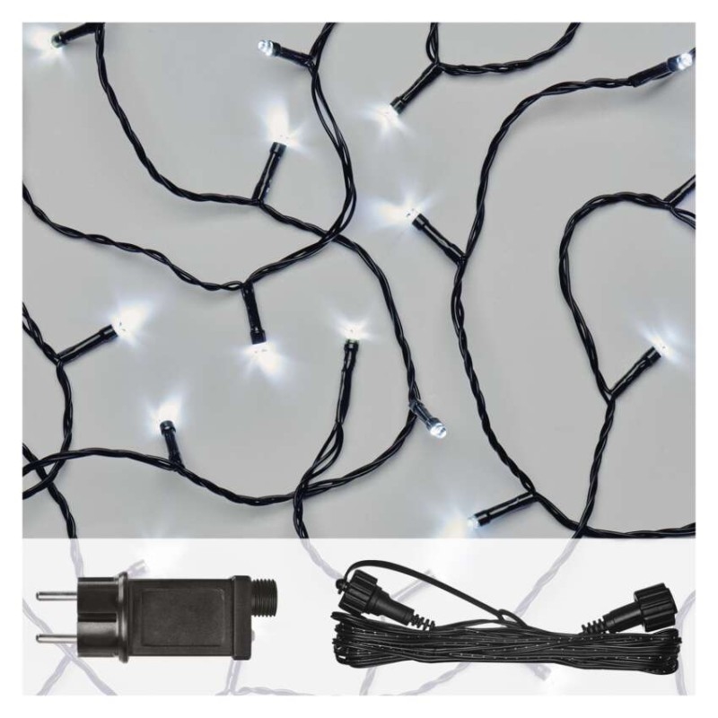 barva drátu: černá|barva světla: studená bílá|časovač: ano|dálkový ovladač: ne|délka přívodu: 5 m|funkce: svítí|krytí: IP44|LED mezera: 10 cm|materiál: PVC|možnost propojení: ano|počet LED: 100|použití: venkovní i vnitřní|příkon: max. 12 W|prodejní obal: 1 ks, krabice|produkt: spojovací řetěz s napájecím zdrojem|pro výšku stromu: neuvádí se|rozměr: 10 m|tvar: klasický|typ napájení: síťový adaptér|velikost LED: 5 mm|vstupní napětí: 230 V AC|výstupní napětí: 30 V DC|záruční doba: 2 roky|životnost: 10 000 hodin