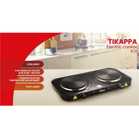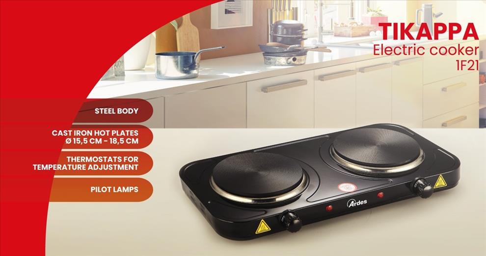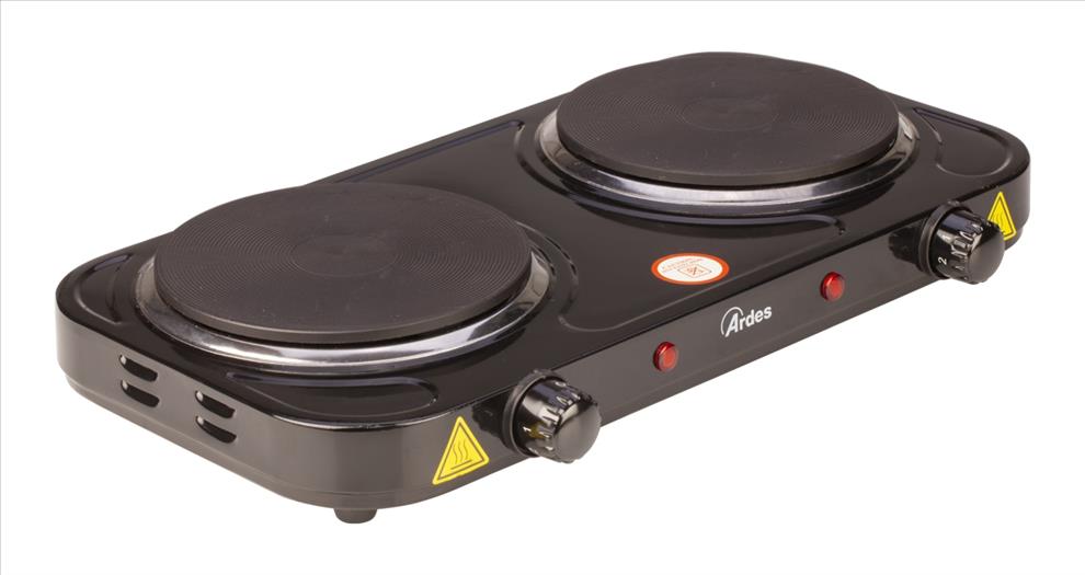Dvouplotýnkový vařič s plotýnkami o průměru 18,5 a 15,5 cm. Ardes 1F21 je vybaven plynule regulovatelným termostatem, 2 světelnými kontrolkami a ochranou proti přehřátí. Rychlé rozpálení plotýnek. Protiskluzové nožky.