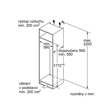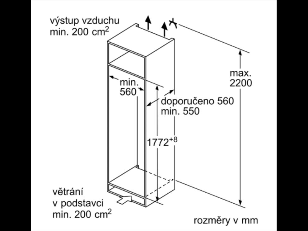 vestavná chladnička s mrazákem • výška 177,2 cm • objem chladničky 246 l / mrazničky 34 l • energetická třída D • zóna hyperFresh pro uskladnění zeleniny a ovoce • elektronické ovládání • funkce superChlazení • systém SoftClose • LED vnitřní osvětlení • držák na láhve • vnitřní displej • možnost změny směru otevírání dveří • varovný signál • hlučnost 35 dB • V × Š × H: 177,2 × 55,8 × 54,8 cm