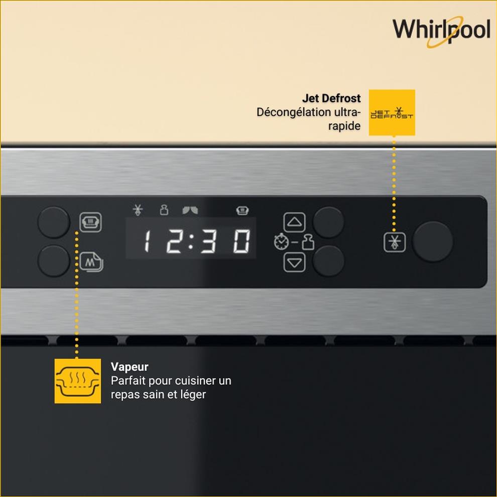 Vestavná mikrovlnná trouba Whirlpool MBNA910X v nerezovém designu vám v mžiku vytvoří chutné pokrmy. Objevte neuvěřitelnou sílu parní funkce pro rychlé a zdravé vaření. Jednoduše vložíte potraviny, přidáte vodu do vyhrazeného příslušenství, zvolíte odpovídající cyklus a během chvilky máte bez námahy skvěle připravené lehké a zdravé jídlo. Tónovaná dvířka se v průběhu spuštění mikrovlnky efektivně mění z tmavě černých na průhledná, takže máte dokonalý přehled o tom, co se děje uvnitř trouby. V případě potřeby můžete použít dětský zámek, který zabraňuje náhodnému použití spotřebiče dětmi.