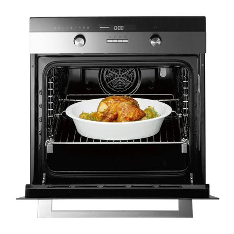 Vestavná trouba ETV6060 nabízí dostatečně velký vnitřní prostor o objemu 70 l, takže v ní pohodlně připravíte i větší množství pokrmů najednou. Vybrat si můžete z 5 zásuvných úrovní, do kterých umístíte rošt i plech.
