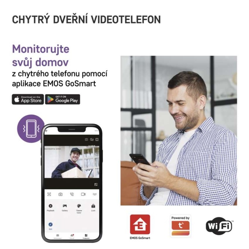 Venkovní kamerová jednotka a LCD monitor videotelefonu IP-750A jsou napájeny z 12 V zdroje, takže není třeba nabíjet nebo měnit baterie. Stačí je připojit k domácí Wi-Fi síti a spárovat s mobilní aplikací EMOS GoSmart, která je dostupná pro Android a iOS. Zařízení také  podporuje hlasové ovládání přes Amazon Alexa a Google Assistant.