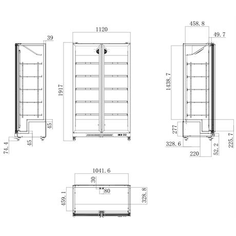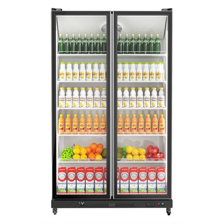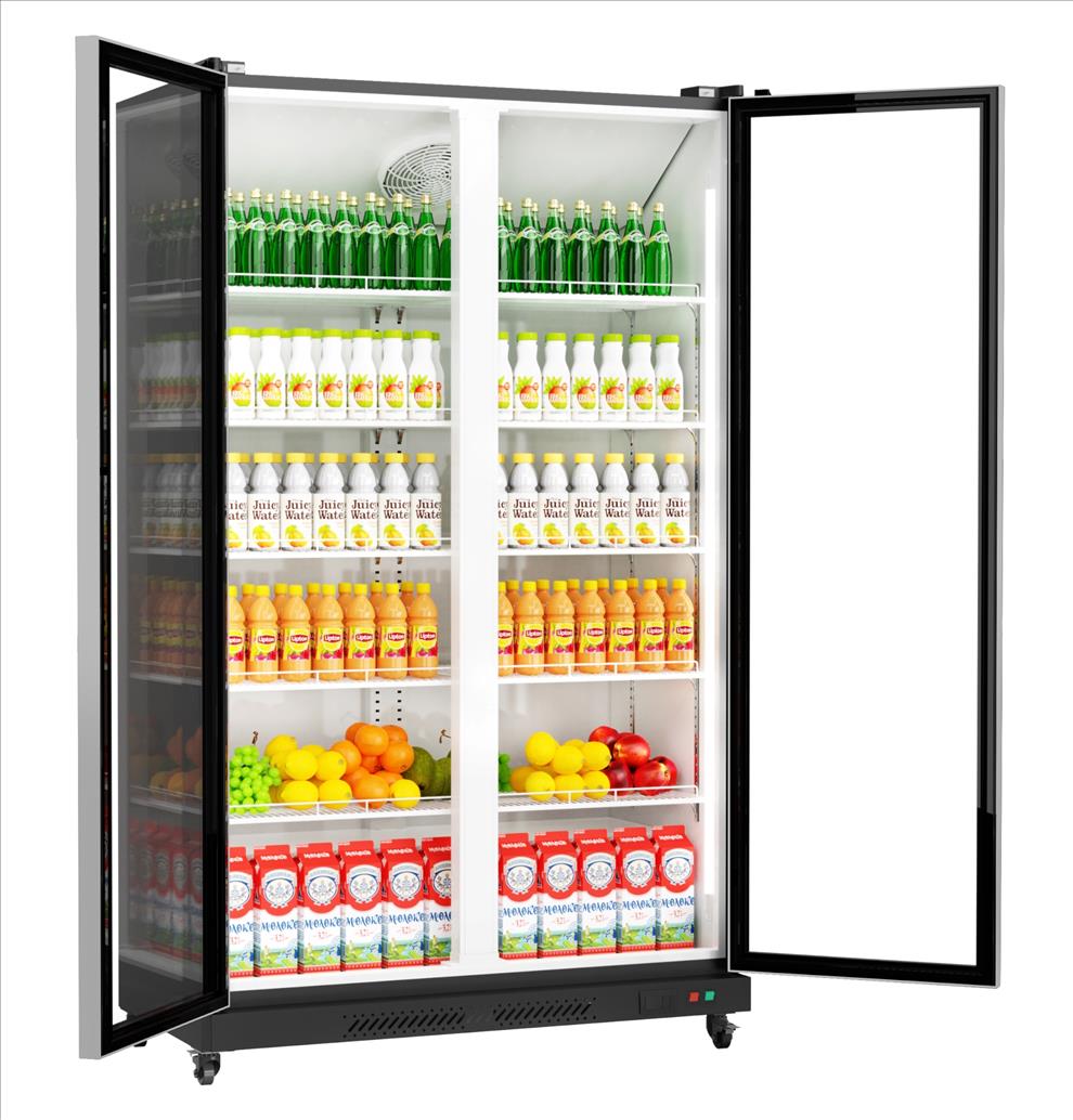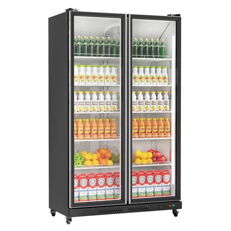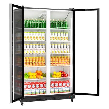Volně stojící moderní chladící vitrína o objemu 798 l a s 5 drátěnými policemi.