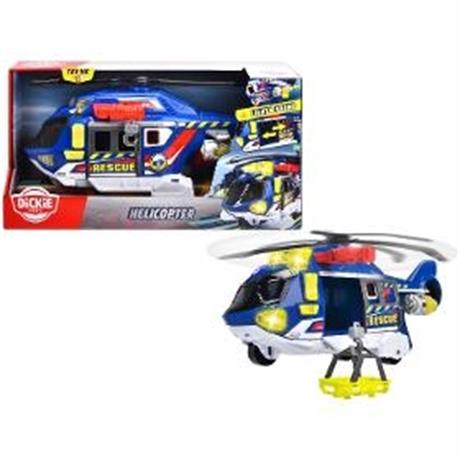 Záchranářská helikoptéra. DICKIE Záchranářská helikoptéra 39 cm. PN D 3307002. . Na volnoběh. Světelné a zvukové efekty. Mechanický pohyb vrtule. Otevírací dveře a pohyblivé části. Součástí je lehátko, které se ovládá tlačítkem (nahoru/dolů). Baterie 2x 1,5V R6. . Délka 39 cm. Věk 3+. . Barva modrá