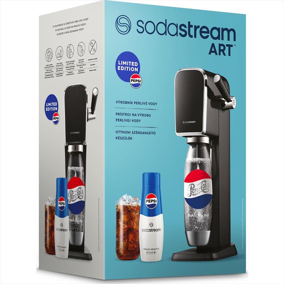 Výrobník SodaStream ART v černé barvě, v limitované edici s ikonickou příchutí PEPSI a speciálním designem lahve s retro logem PEPSI MADE BY ME, lahev s kovovými prvky je znovupoužitelná a vhodná do myčky