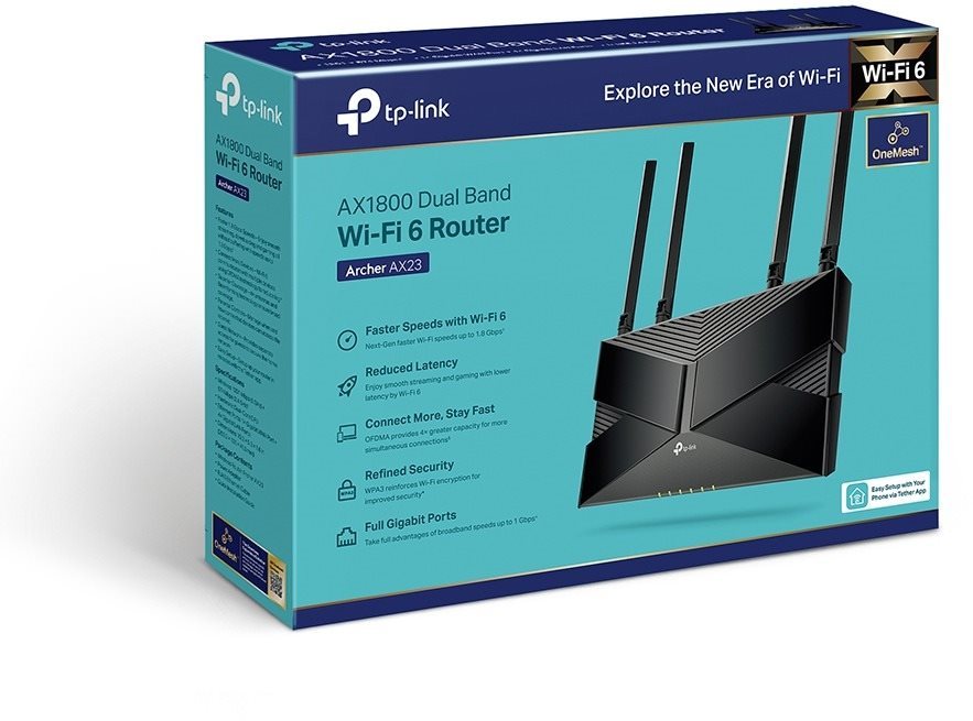 S Wi-Fi routerem TP-Link Archer AX23 si v domácnosti vytvoříte ideální podmínky pro rychlé a bezproblémové internetové připojení. Router pracuje ve dvou pásmech a díky moderní technologii Wi-Fi 6 zvládne zajistit připojeným přístrojům rychlost internetu až 1,8 Gb/s. Pokud vaše zařízení nepodporují bezdrátové připojení, můžete využít nabídku LAN portů a zapojit je pomocí kabelu. Svou síť nastavíte a spravujete přes aplikaci Tether v chytrém telefonu, všechna data máte vždy přehledně k dispozici.