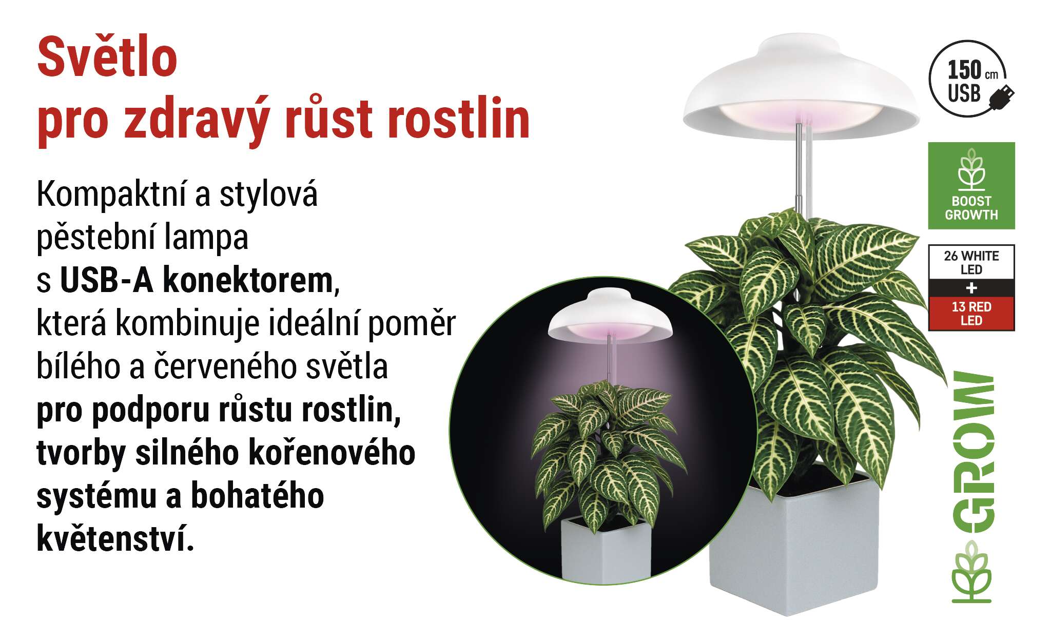 • 5× červené LED urychlují růst listů a stonků, podporují zakořeňování a stimulují