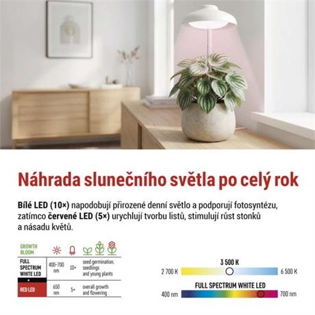 • 10× bílé LED simulují denní světlo, podporují fotosyntézu a zajišťují přirozený vzhled a sytou barvu listů