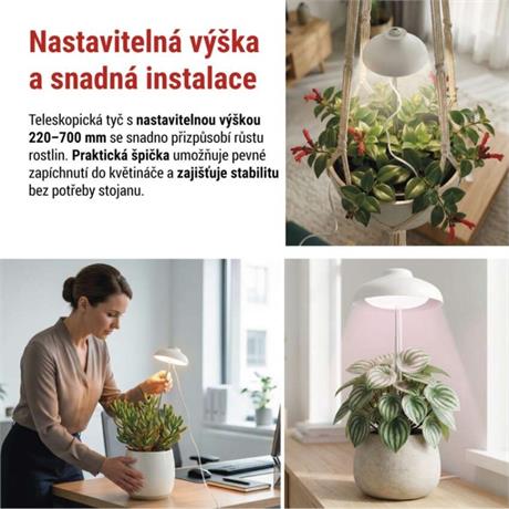 LED Pěstební lampa Z7901 je kompaktní, elegantní a technicky promyšlené řešení pro podporu růstu pokojových rostlin, bylinek i sukulentů v domácím prostředí. Díky kombinaci plnospektrálního bílého a červeného LED světla poskytuje rostlinám přesně takové spektrum, jaké potřebují pro fotosyntézu, tvorbu silných kořenů, zdravý růst listů a bohaté květenství.
