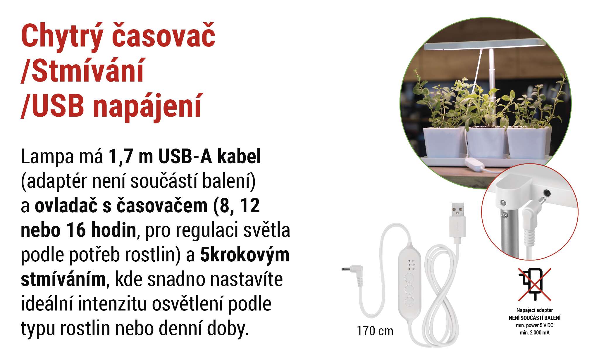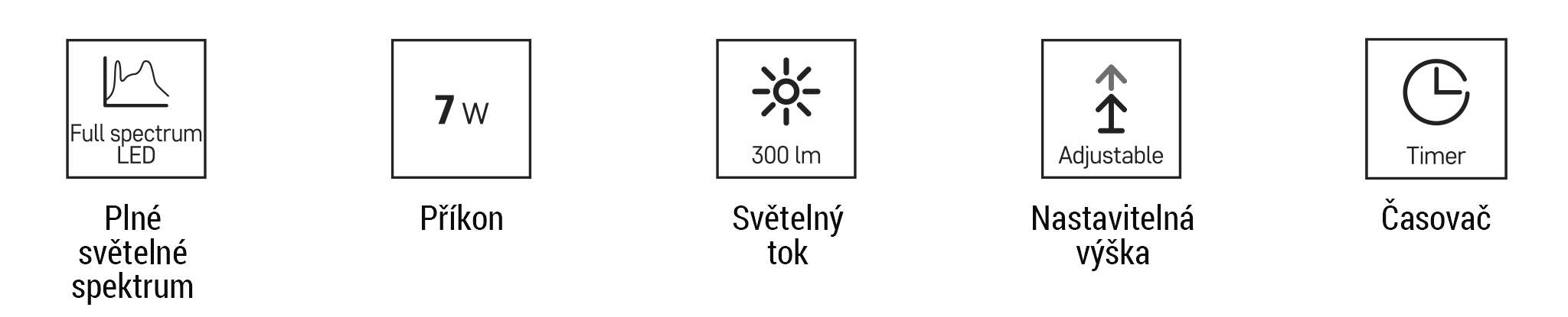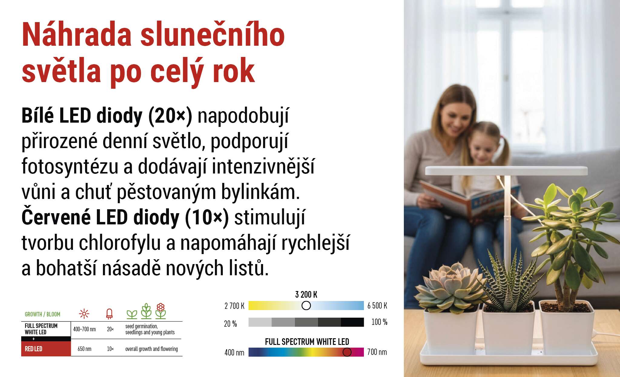 bílé LED zajišťují přirozené světlo pro zdravý růst a správný tvar listů