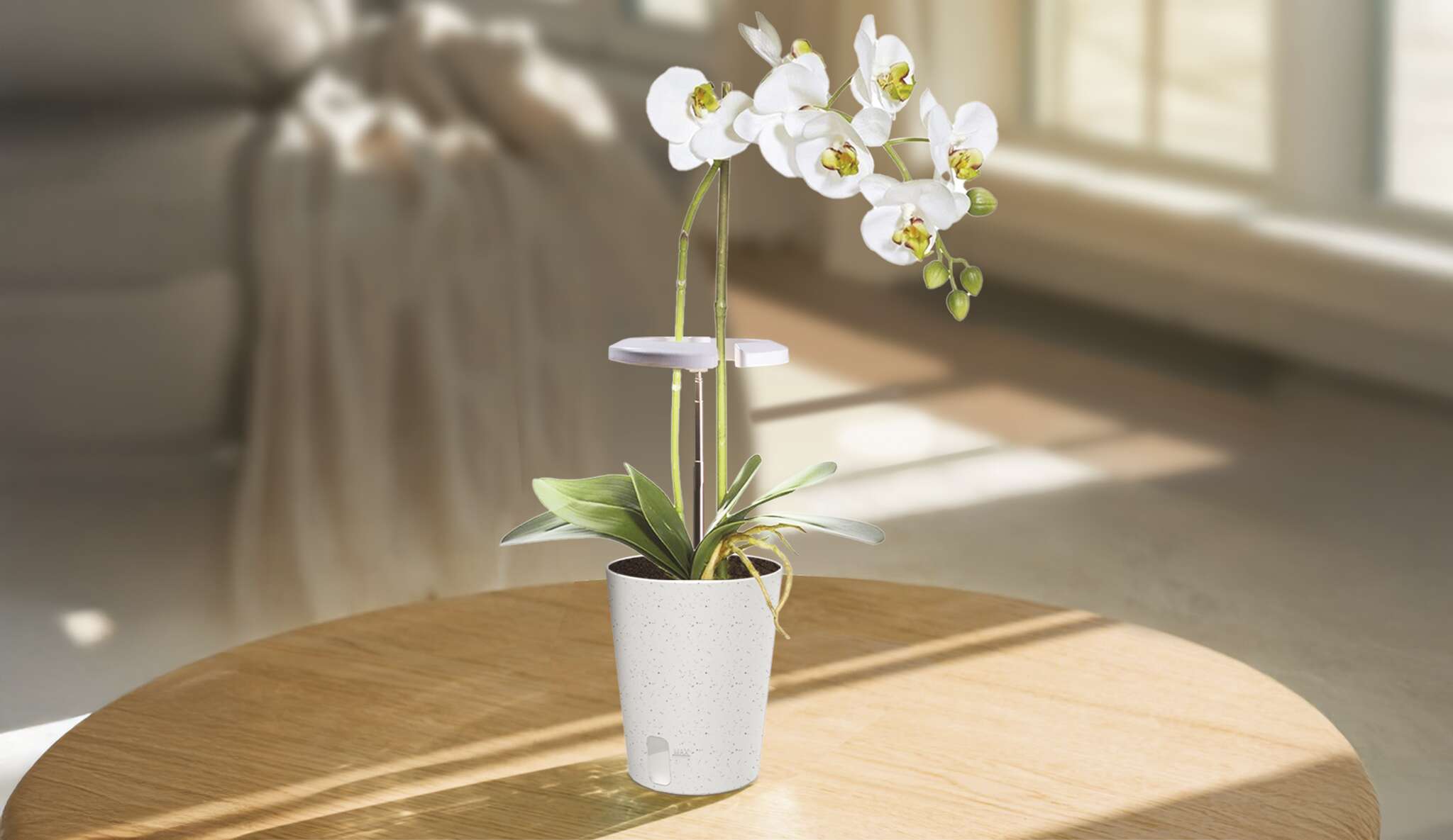Kruhové svítidlo je navrženo tak, aby se dalo umístit i pod květy rostliny a osvětlovalo je jemně zespodu směrem k listům a stonkům. Díky tomu poskytuje rostlinám dostatek světla pro růst, aniž by docházelo k přímému přehřívání nebo poškození citlivého květenství. Je tak ideálním řešením pro orchideje a všechny rostliny s citlivým květenstvím.