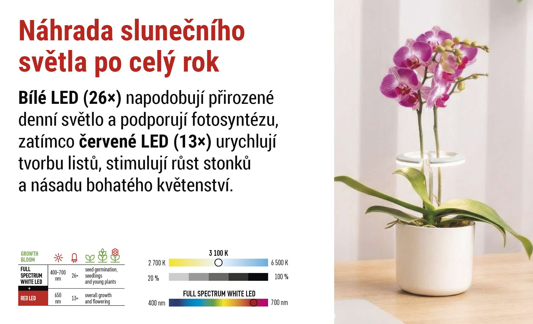 PLNOSPEKTRÁLNÍ LED SVĚTLO - Napodobuje přirozené sluneční spektrum.
