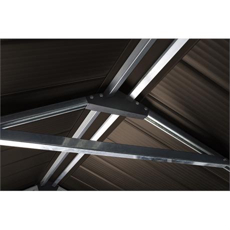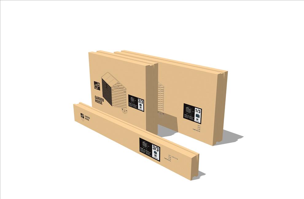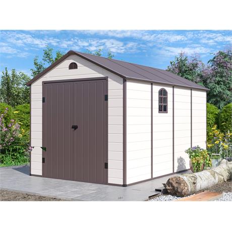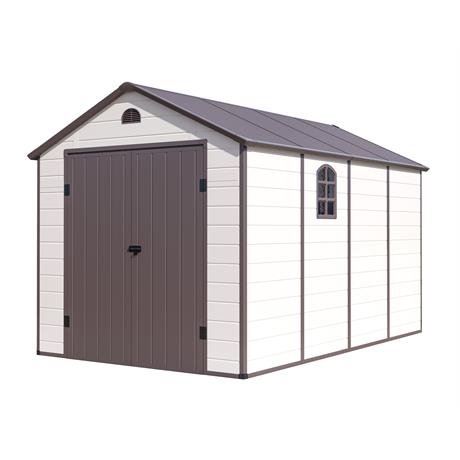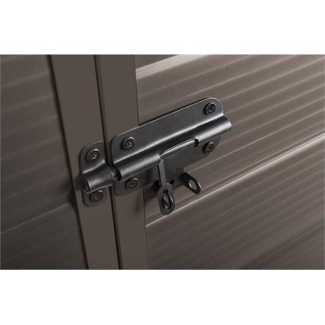 sendvičového tvrzeného plastu. Střecha zahradního domku je zkonstruována tak, aby vydržela zatížení až 60 kg/m2. Na přední straně domku jsou umístěny dvoukřídlé dveře o šířce 151 cm a výšce 183 cm, které zajišťují snadný přístup.
