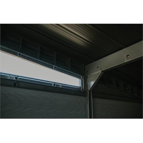 Zahradní domek je vybavený silnou střechou, která je vyztužená ocelí. Vydrží zatížení až do 200 kg/m², takže hravě odolá i haldě sněhu. Má dvojité dveře a malá okénka, skrze které se dovnitř dostane sluneční svit. Výrobce se také postaral o vhodný ventilační systém. Do domku se dostane dostatek vzduchu, který brání hromadění vlhkosti. Přední dveře jsou opatřeny západkou, na kterou lze nasadit visací zámek pro větší bezpečnost.