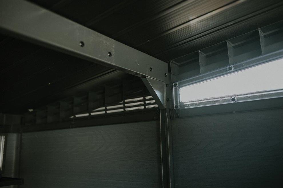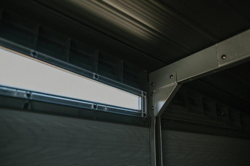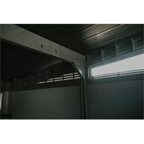 Zahradní domek je vybavený silnou střechou, která je vyztužená ocelí. Vydrží zatížení až do 200 kg/m², takže hravě odolá i haldě sněhu. Má dvojité dveře a malá okénka, skrze které se dovnitř dostane sluneční svit. Výrobce se také postaral o vhodný ventilační systém. Do domku se dostane dostatek vzduchu, který brání hromadění vlhkosti. Přední dveře jsou opatřeny západkou, na kterou lze nasadit visací zámek pro větší bezpečnost.