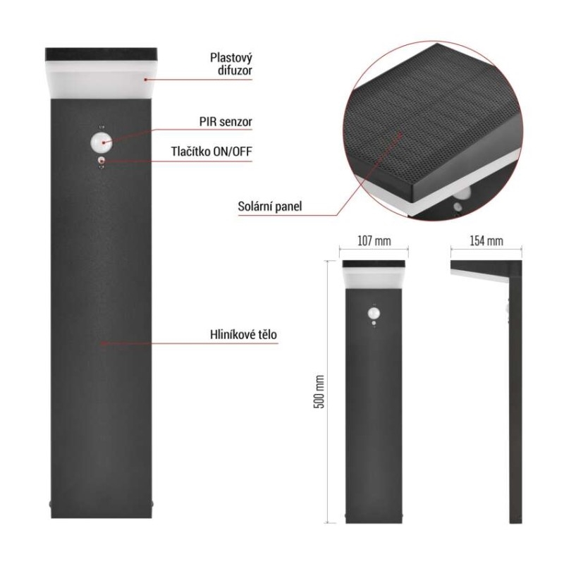 Díky solárnímu napájení je instalace extrémně jednoduchá – bez nutnosti zásahu do elektroinstalace. Stačí umístit na vhodné slunné místo a svítidlo je připraveno k provozu.