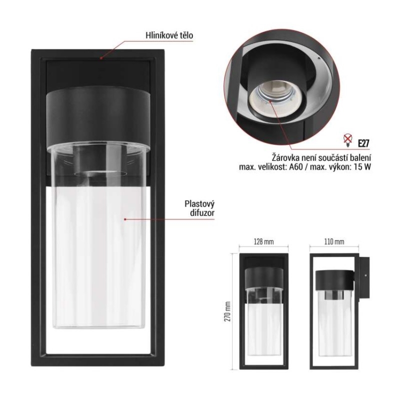 barva: černá|barva světla: –|dosah PIR senzoru: –|energetická třída použitého světelného zdroje: –|fotovoltaický článek: ne|frekvence: 50/60 Hz|index podání barev (CRI): –|kategorie: CLASSIC|krytí: IP44|materiál: hliník|materiál difuzoru: plast|napájení: 230 V AC|napětí: 220-240 V~|patice (uchycení žárovky): E27|PIR senzor: ne|příkon: –|prodejní obal: 1 ks, krabička|řada: TILLIA|rozměr: 128 × 110 × 270 mm|rozsah pracovní teploty: -20 ~ +40 °C|soumrakový spínač: ne|světelný tok: –|teplota chromatičnosti: –|vestavěný vypínač: ne|žárovka součástí balení: ne|zdroj světla: –|životnost: –