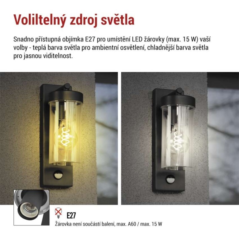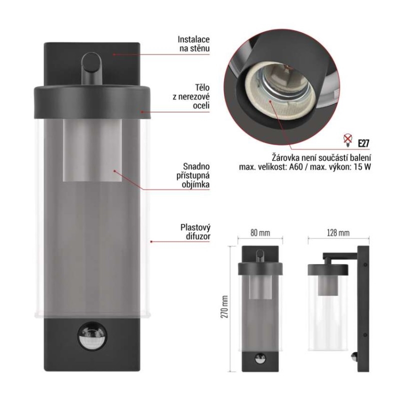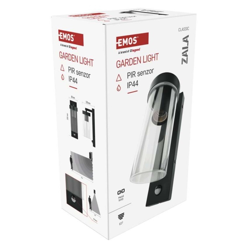 EMOS Zahradní nástěnné svítidlo ZALA, čidlo soumraku, 14,5 x 8,9 x 26,2 cm, 1 x E27, 15 W