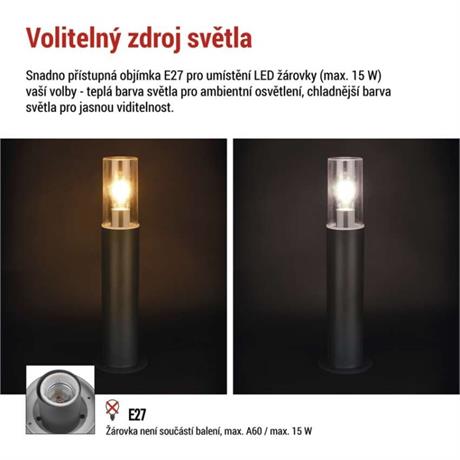 barva: antracit|barva světla: –|dosah PIR senzoru: –|energetická třída použitého světelného zdroje: –|fotovoltaický článek: ne|frekvence: 50/60 Hz|index podání barev (CRI): –|kategorie: CLASSIC|krytí: IP44|materiál: nerezová ocel|materiál difuzoru: plast|napájení: 230 V AC|napětí: 220-240 V~|patice (uchycení žárovky): E27|PIR senzor: ne|příkon: –|prodejní obal: 1 ks, krabička|řada: ZALA|rozměr: 140 × 140 × 500 mm|rozsah pracovní teploty: -20 ~ +40 °C|soumrakový spínač: ne|světelný tok: –|teplota chromatičnosti: –|vestavěný vypínač: ne|žárovka součástí balení: ne|zdroj světla: –|životnost: –