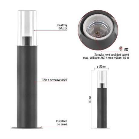 EMOS Zahradní sloupkové svítidlo ZALA, 14 x 14 x 50 cm, 1 x E27, 15 W