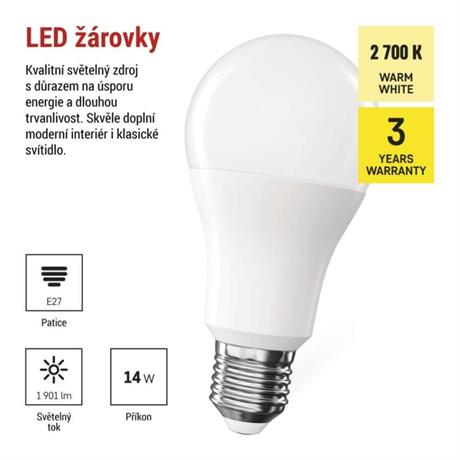 barva světla: teplá bílá|energetická třída: D|frekvence: 50/60 Hz|index podání barev (CRI): 80|kompatibilita: –|náhrada za žárovku: 120 W|napětí: 220-240 V~|notifikace do mobilní aplikace: –|ovládání hlasovými asistenty: –|patice (uchycení žárovky): E27|počet čipů: –|počet spínacích cyklů: 30 000|podporované OS: –|přenosová frekvence: –|příkon: 14 W|prodejní obal: 1 ks, krabička|protokol: –|řada: CLASSIC|rozměr: 60 × 60 × 120 mm|stmívatelná: ne|světelná účinnost: 136 lm/W|světelný tok: 1 901 lm|technologie: LED|teplota chromatičnosti: 2 700 K|tvar: Classic A60|typ čipů: SMD|účiník: 0,59|úhel vyzařování: 180°|záruční doba: 3 roky|životnost: 30 000 hodin