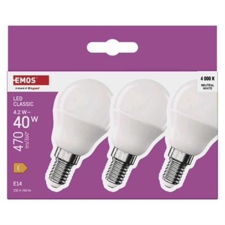 barva světla: neutrální bílá|energetická třída: E|index podání barev (CRI): 80|kompatibilita: –|náhrada za žárovku: 40 W|napětí: 230 V~/50 Hz|notifikace do mobilní aplikace: ne|ovládání hlasovými asistenty: ne|patice (uchycení žárovky): E14|počet čipů: neuvádí se|počet spínacích cyklů: 30 000|podporované OS: –|přenosová frekvence: –|příkon: 4,2 W|prodejní obal: 3 ks, krabička|protokol: –|řada: CLASSIC|rozměr: 45 × 45 × 82 mm|stmívatelná: ne|světelná účinnost: 112 lm/W|světelný tok: 470 lm|technologie: LED|teplota chromatičnosti: 4 000 K|tvar: Mini Globe|typ čipů: SMD|účiník: 0,50|úhel vyzařování: 150°|záruční doba: 3 roky|životnost: 30 000 hodin
