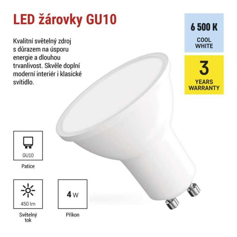 barva světla: studená bílá|energetická třída: E|frekvence: 50/60 Hz|index podání barev (CRI): 80|kompatibilita: –|náhrada za žárovku: 39 W|napětí: 220-240 V~|notifikace do mobilní aplikace: –|ovládání hlasovými asistenty: –|patice (uchycení žárovky): GU10|počet čipů: –|počet spínacích cyklů: 30 000|podporované OS: –|přenosová frekvence: –|příkon: 4 W|prodejní obal: 1 ks, krabička|protokol: –|řada: CLASSIC|rozměr: 50 × 50 × 58 mm|stmívatelná: ne|světelná účinnost: 113 lm/W|světelný tok: 450 lm|technologie: LED|teplota chromatičnosti: 6 500 K|tvar: MR16|typ čipů: SMD|účiník: 0,50|úhel vyzařování: 100°|záruční doba: 3 roky|životnost: 30 000 hodin