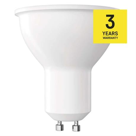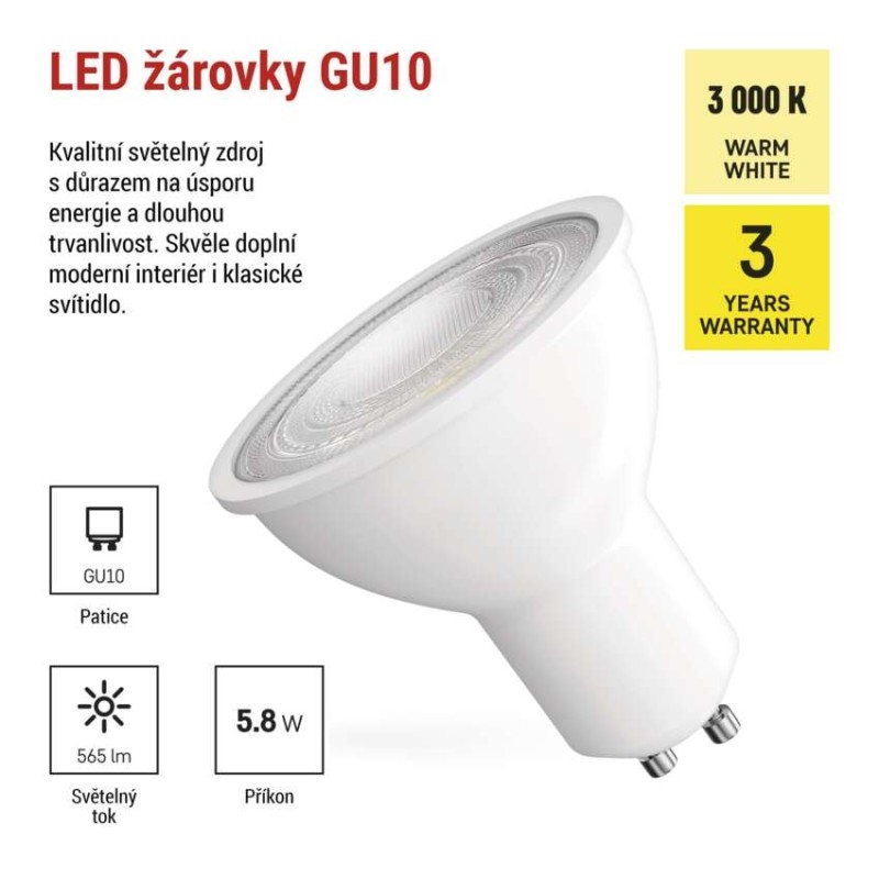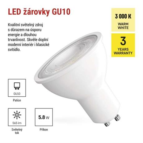barva světla: teplá bílá|energetická třída: E|frekvence: 50/60 Hz|index podání barev (CRI): 80|kompatibilita: –|náhrada za žárovku: 75 W|napětí: 220-240 V~|notifikace do mobilní aplikace: –|ovládání hlasovými asistenty: –|patice (uchycení žárovky): GU10|počet čipů: –|počet spínacích cyklů: 30 000|podporované OS: –|přenosová frekvence: –|příkon: 5,8 W|prodejní obal: 1 ks, krabička|protokol: –|řada: CLASSIC|rozměr: 50 × 50 × 56 mm|stmívatelná: ne|světelná účinnost: 115 lm/W|světelný tok: 565 lm|technologie: LED|teplota chromatičnosti: 3 000 K|tvar: MR16|typ čipů: SMD|účiník: 0,50|úhel vyzařování: 36°|záruční doba: 3 roky|životnost: 30 000 hodin