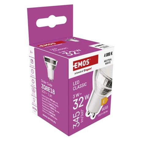 barva světla: neutrální bílá|energetická třída: E|index podání barev (CRI): 80|kompatibilita: –|náhrada za žárovku: 32 W|napětí: 230 V~/50 Hz|notifikace do mobilní aplikace: ne|ovládání hlasovými asistenty: ne|patice (uchycení žárovky): GU10|počet čipů: neuvádí se|počet spínacích cyklů: 30 000|podporované OS: –|přenosová frekvence: –|příkon: 3 W|prodejní obal: 1 ks, krabička|protokol: –|řada: CLASSIC|rozměr: 50 × 50 × 55 mm|stmívatelná: ne|světelná účinnost: 115 lm/W|světelný tok: 345 lm|technologie: LED|teplota chromatičnosti: 4 000 K|tvar: MR16|typ čipů: SMD|účiník: 0,40|úhel vyzařování: 100°|záruční doba: 3 roky|životnost: 30 000 hodin