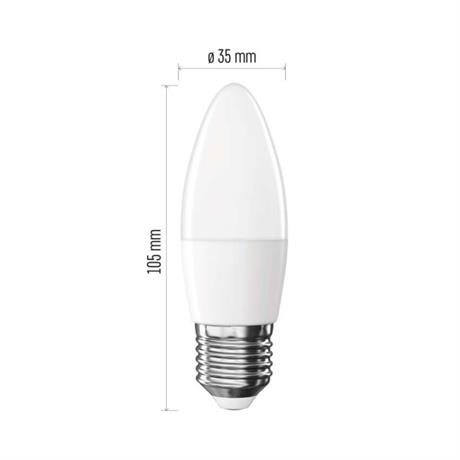 barva světla: neutrální bílá|energetická třída: E|index podání barev (CRI): 80|kompatibilita: –|náhrada za žárovku: 40 W|napětí: 230 V~/50 Hz|notifikace do mobilní aplikace: ne|ovládání hlasovými asistenty: ne|patice (uchycení žárovky): E27|počet čipů: neuvádí se|počet spínacích cyklů: 30 000|podporované OS: –|přenosová frekvence: –|příkon: 4,2 W|prodejní obal: 1 ks, krabička|protokol: –|řada: CLASSIC|rozměr: 35 × 35 × 105 mm|stmívatelná: ne|světelná účinnost: 112 lm/W|světelný tok: 470 lm|technologie: LED|teplota chromatičnosti: 4 000 K|tvar: svíčka|typ čipů: SMD|účiník: 0,50|úhel vyzařování: 240°|záruční doba: 3 roky|životnost: 30 000 hodin
