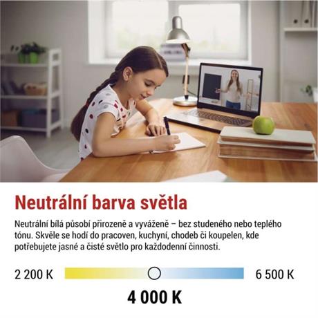 barva světla: neutrální bílá|energetická třída: D|index podání barev (CRI): 80|kompatibilita: neuvádí se|náhrada za žárovku: 60 W|napětí: 230 V~/50 Hz|notifikace do mobilní aplikace: neuvádí se|ovládání hlasovými asistenty: neuvádí se|patice (uchycení žárovky): E27|počet čipů: 4|počet spínacích cyklů: 25 000|podporované OS: neuvádí se|přenosová frekvence: neuvádí se|příkon: 5,9 W|prodejní obal: 3 ks, krabička|protokol: neuvádí se|řada: FILAMENT|rozměr: 60 × 60 × 108 mm|stmívatelná: ne|světelná účinnost: 137 lm/W|světelný tok: 806 lm|technologie: LED|teplota chromatičnosti: 4 000 K|tvar: A60|typ čipů: COB|účiník: 0,50|úhel vyzařování: 360°|záruční doba: 3 roky|životnost: 25 000 hodin