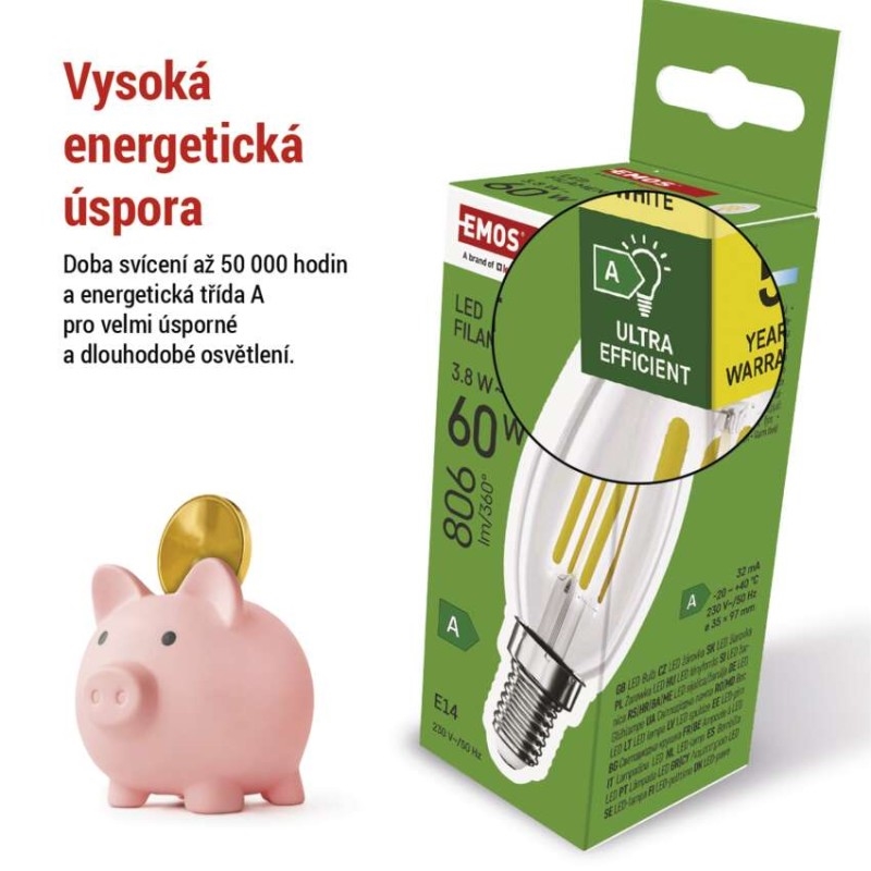 barva světla: teplá bílá|energetická třída: A|index podání barev (CRI): 80|kompatibilita: neuvádí se|náhrada za žárovku: 60 W|napětí: 230 V~/50 Hz|notifikace do mobilní aplikace: neuvádí se|ovládání hlasovými asistenty: neuvádí se|patice (uchycení žárovky): E14|počet čipů: 4|počet spínacích cyklů: 30 000|podporované OS: neuvádí se|přenosová frekvence: neuvádí se|příkon: 3,8 W|prodejní obal: 1 ks, krabička|protokol: neuvádí se|řada: FILAMENT|rozměr: 35 × 35 × 97 mm|stmívatelná: ne|světelná účinnost: 212 lm/W|světelný tok: 806 lm|technologie: LED|teplota chromatičnosti: 2 700 K|tvar: svíčka|typ čipů: COB|účiník: 0,5|úhel vyzařování: 360°|záruční doba: 5 let|životnost: 50 000 hodin