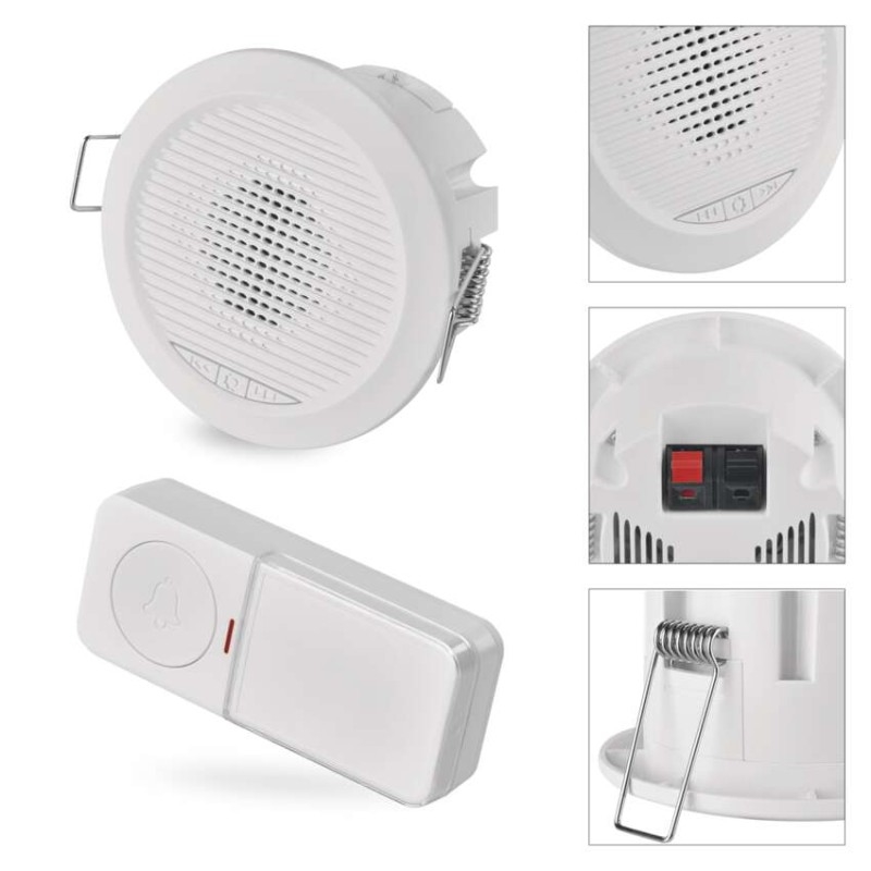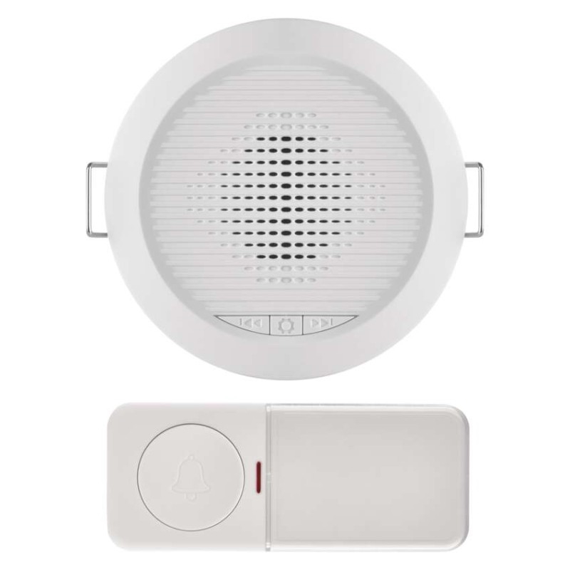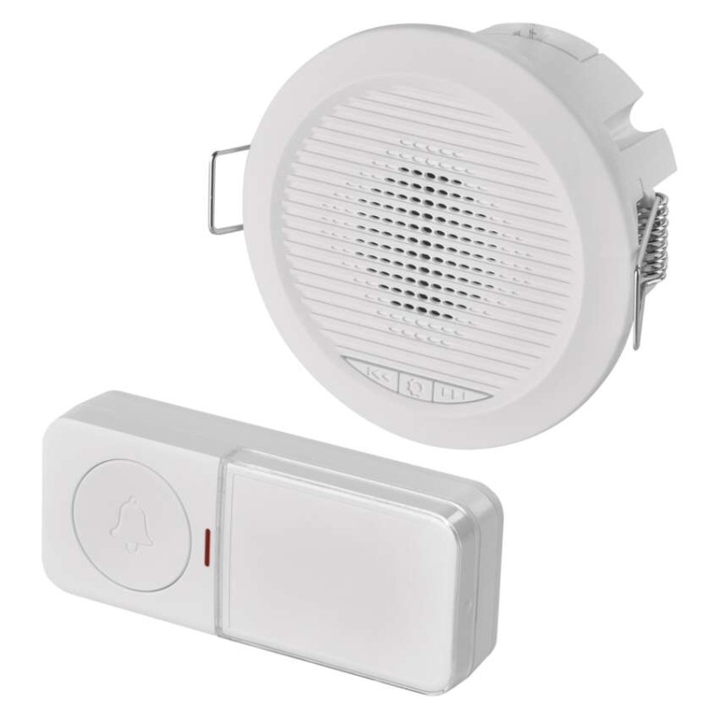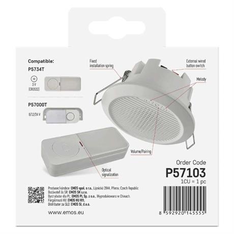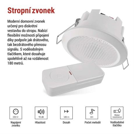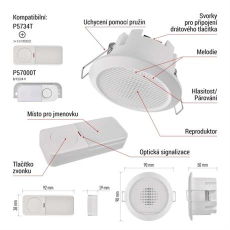 barva: bílá|další funkce: –|dosah tlačítka: 180 m nebo drátové spojení|hlasová komunikace: ne|instalační materiál: –|jazyky aplikace: –|kompatibilita: –|maximální hlasitost zvonění: 90 dB|možnost přidat další tlačítko: ano, max. 8|napájení hlavní jednotky: 230 V AC|napájení tlačítka: 1× 3 V CR2032 (součástí balení)|notifikace do mobilní aplikace: ne|optická signalizace na tlačítku: ano|optická signalizace na zvonku: ne|ovládání hlasovými asistenty: ne|počet melodií: 10|počet přijímačů v balení: 1 ks|počet tlačítek v balení: 1 ks|podporované OS: –|přenosová frekvence: 433 MHz|přídavné (náhradní) tlačítko: P5734T; P57000T|prodejní obal: 1 ks, krabička|protokol: –|řada: –|regulace hlasitosti: ano, 4 úrovně|rozměr tlačítka: 19 × 38 × 92 mm|rozměr zvonku: 90 × 50 mm|speciální funkce: duální připojení tlačítka|voděodolné tlačítko: IP54|způsob párování: automatické párování–self-learning|způsob přenosu: bezdrátový/drátový zvonek